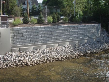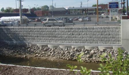 The original plan was to use gabion baskets for the wall on the north side of 10 Mile Creek with no specification for a wall on the south bank of the creek. Soon after excavation began, it was discovered that an existing foundation on the north bank would impede the installation of the gabion system. This foundation was in good condition and there was no reason to disturb it in order to tie back the gabion baskets. Some unexpected tree removal on the south bank created the need for a wall on that side as well. Redi-Rock was called upon due to its ability to be installed with minimal excavation and no reinforcing.